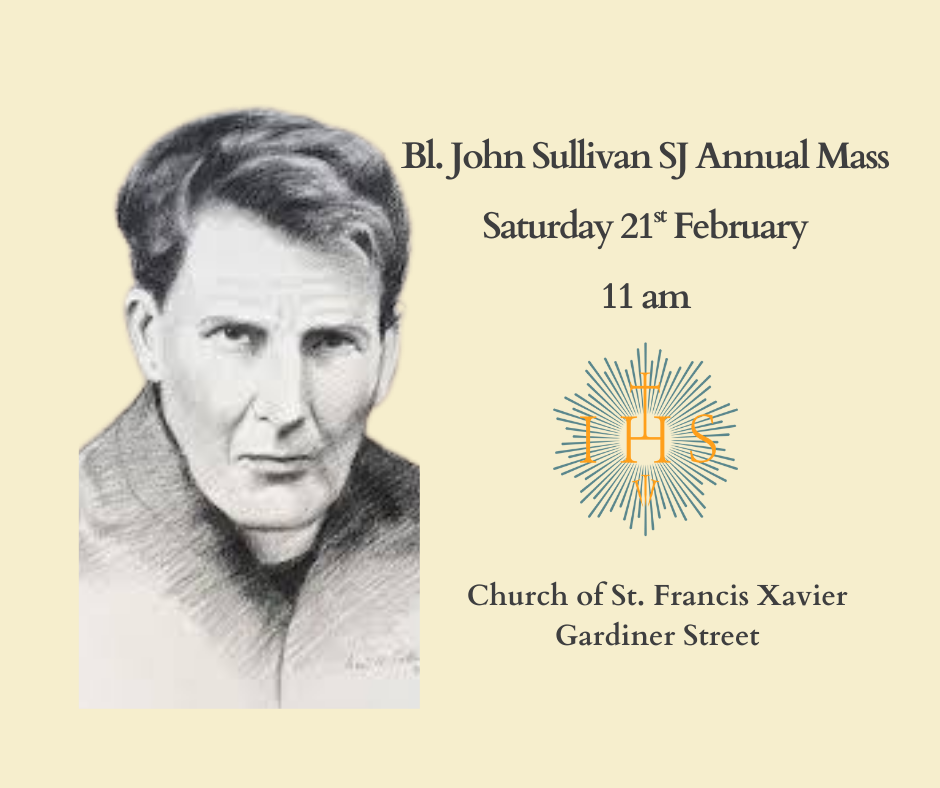 You are cordially invited to attend the Annual Mass in honour of Bl. John Sullivan on Saturday, 21st February at 11am. The Mass will be presided over by Archbishop Dermot Farrell, with Church of Ireland Archbishop Michael Jackson preaching. NOTE this Mass is at 11am, NOT at 1pm. It replaces the usual monthly Mass.